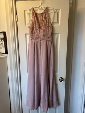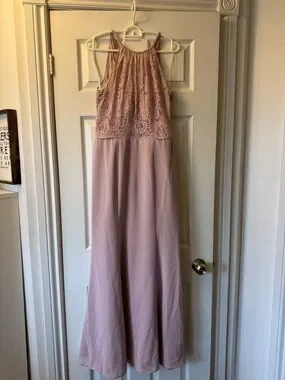 Halter neckline with intricate lace bodice. Smooth, flowing maxi skirt for an elongated silhouette. Soft blush pink hue for a romantic look. Ideal for formal events and weddings.