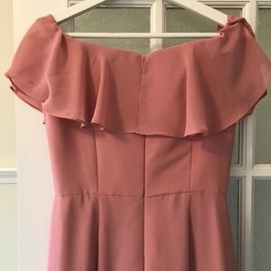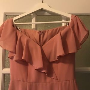 OFF-THE-SHOULDER DRAPED RUFFLE FAUX WRAP TRUMPET GOWN in Desert Rose. Size 6. Unaltered.