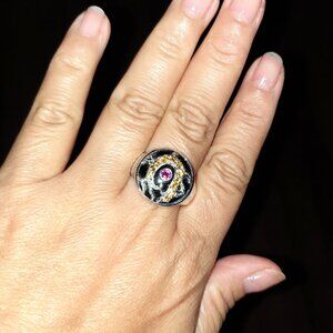 This ring is unique in the marketplace. It is designed in 925 Sterling Silver and features a round black onyx face with natural citrine and ruby stones decorated on top.