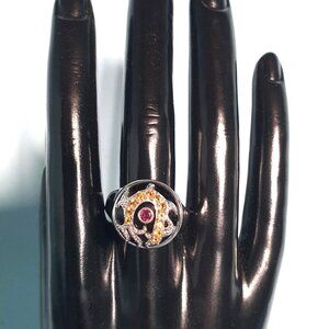 Detailed 925 Silver Round Black Onyx, Natural Citrine & Red Ruby Unisex Ring