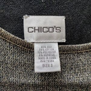There are dressy tanks … and then there is this gorgeous metallic tank from Chico’s! This sleeveless scoop neck top is made from a fine knit blend of silk, cotton, polyester and metallic - hand washable and SO worth it! The slight A-line styling makes it a flattering tank top to pair with anything - and go anywhere! Black and gold metallic is a statement - and this is a statement piece that’s a must for your wardrobe! This is a Chico’s size 2 which equals a size 12 in regular sizing. Please see the last picture for the Chico’s size chart and note the measurements below.