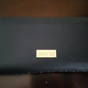 Fully zipped, with an inner zippered compartment and many slots for credit cards and ID.