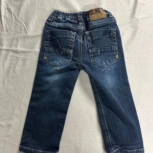 Comfortable denim jeans with elastic cuffs. Features stylish back pockets.