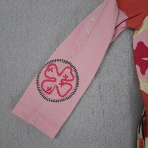 This authentic Deux par Deux 2-piece outfit is straight from the mid 2000s and full of Y2K boho charm. The set includes a bright long sleeve top with colorblock appliqué and floral embroidery, paired with striped velour flare pants with adjustable waist and pockets. A boutique Canadian gem from the 2000s that’s stylish and hard to find.