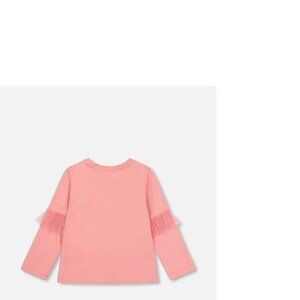 Frills on each arm add an ultra-girly twist this casual, colorful organic cotton tee shirt. T-Shirt With mesh Frills features long sleeves, a round neckline, and a cute kitty cat print on the chest.