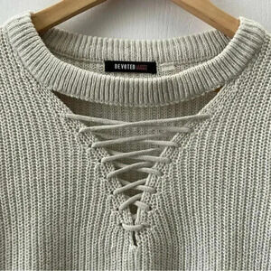 Devoted Sweater Lace Front Keyhole Neckline High Low Hem Light Beige Small