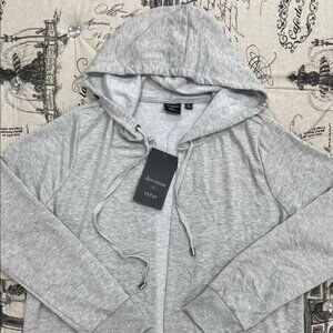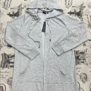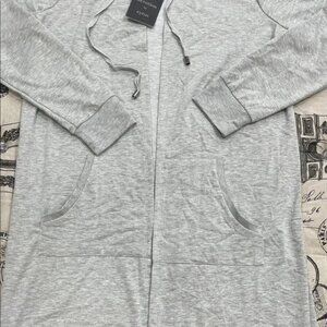 Chic gray cardigan with a hood. Ideal for layering. Comfortable and stylish.