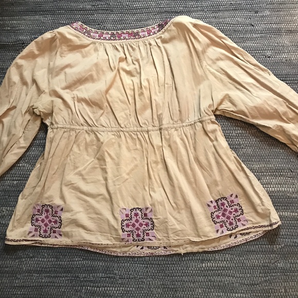 Beautiful Peasant blouse from Dex in a soft grey. Purple embroidery and beading decorate the neckline and hem. Drawstring waist, elbow length sleeves and notched scoop neckline. 100% Cotton. In very good preworn condition. One missing bead. (see pic)