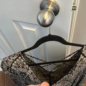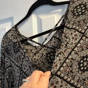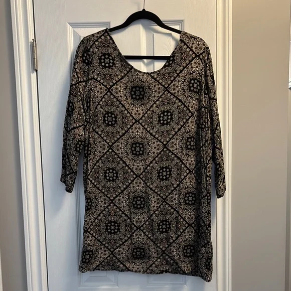 Long tunic shirt with a black and beige geometric pattern. Perfect for dressing up or casual with jeans. Worn out only once, like new condition.