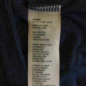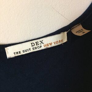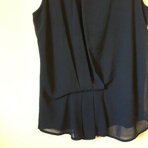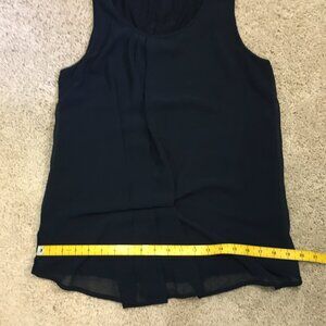 Very good preowned condition, dark navy blue/almost black, sleeveless, tank top by Dex New York. This top is simply amazing with it's unique pleat pattern and is highly reminiscent of the fit, flare and bizarre luxury of the art deco period. Simplicity with a twist. Has a layer of lining to ensure modesty on account of its sheer quality. Back is more of a jersey like.