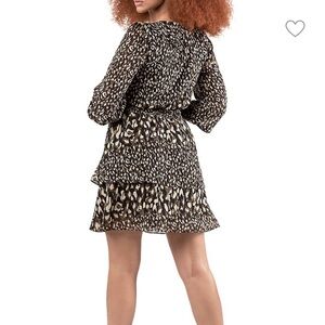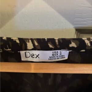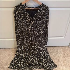 Chic mini dress with a stylish pattern in black, white and camo green. Women’s size large. Features a flowy silhouette and elegant design. Ideal for any occasion. In excellent like new condition.
