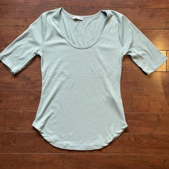 Brand new condition. Worn only once Soft ribbed material. Mint green color Curved hem Pit to pit: 15.5” Sleeve: 5.5” Length: 24”