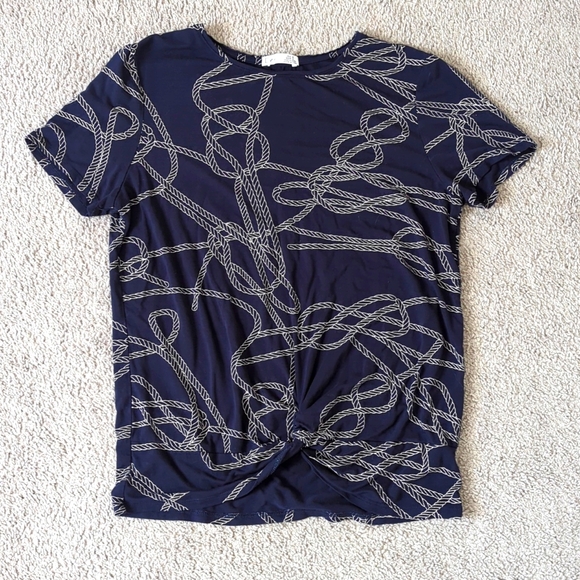 EUC. Cool rope pattern and twisted front to add interesting details, nice flattering fit. Unsure of the material as tag is cut out but it's thin, light and very soft.