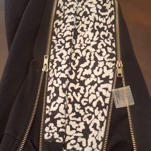 Pull on closure - Front fabric with cheetah design and plain black at the back with side slits trimmed with rusted gold zippers. Long Sleeves with crew neck. Never worn.