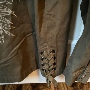 Beautiful and casual Dex Outerwear Collection utility jacket in khaki green with a beautiful embroidery detail of a parrot on the pack. Side ties for added flair and adjustability, two front flap pockets.