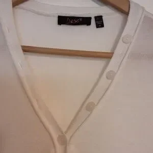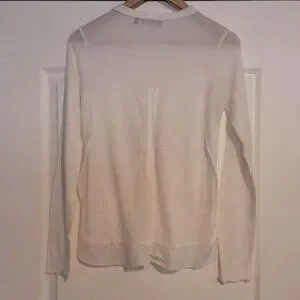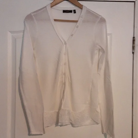 Lightweight knit, cream clour, long sleeve, button up top. Cute lace detailing at sides and front. Marked medium but seems to fit small. PTP 16".