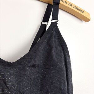 This is a strappy seamless sports bra in black with gold metallic sparkle. Ideal for yoga, lounging, or low-impact workouts, it features cup inserts and adjustable hook-and-eye straps for a custom fit. Fits like a small. Soft, stretchy, and breathable for all-day comfort.