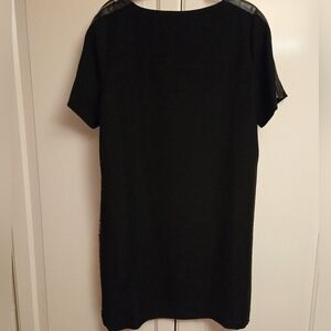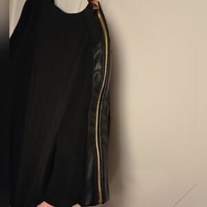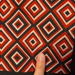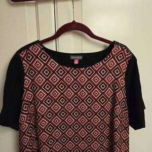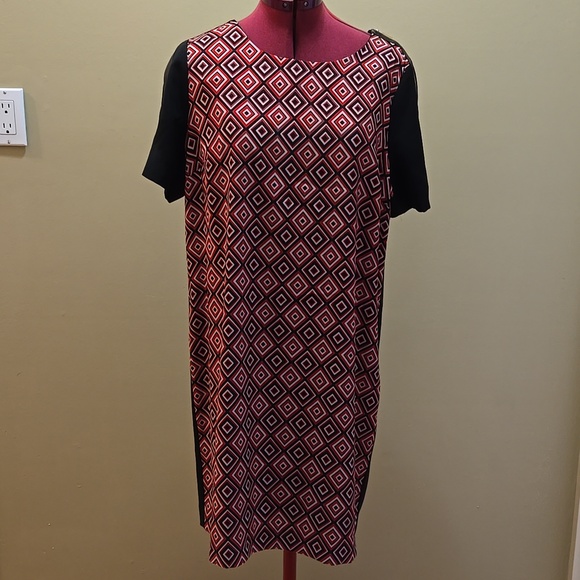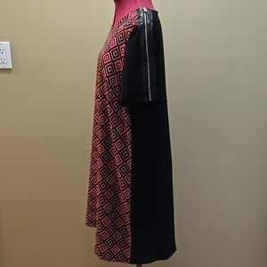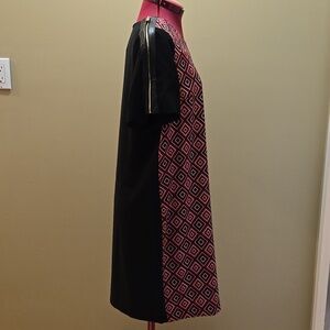Stylish dress with a geometric pattern. Features a mix of red and black colours. Features gold zipper shoulder detail.