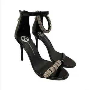 These sophisticated heels showcase a luxurious black body adorned with sparkling silver crystal details, perfect for formal occasions. The slender stiletto heel and open-toe design add a touch of elegance, making them an ideal choice for evening wear.