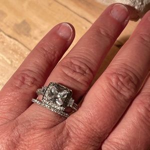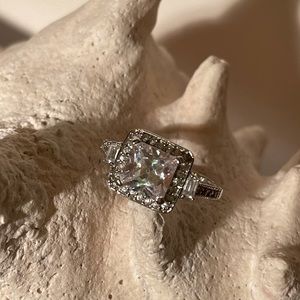 Spectacular sparkly princess cut Art Deco inspired ring set in sterling silver rhodium plated (which gives it this bright white coloured finish ). It won’t tarnish. This is NOT a real diamond, but you’d swear it is! Stunning design, millwork on sides, tiny pavé stones surrounding approx 3 ct. I’ve shown it with my own white gold wedding band so you can see how beautifully it pairs with another ring.