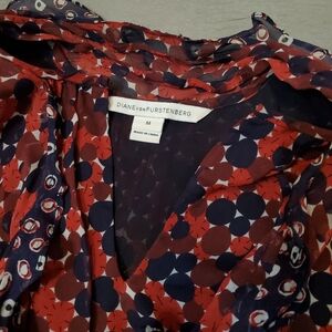 Diane Von Furstenberg 100% silk sleeveless top. V neck. Built in scarf (not removable). Patterns. Red, navy blue. Size M, see pictures for measurements. Fabric is lightweight, flowy and a bit see through (sheer). 100% polyester lining. A few small subtle pulled threads around the top (example seen on pictures). No stain, no rip. Non smoking house.