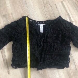 Stylish black crochet cardigan with open-front design. Perfect for layering.