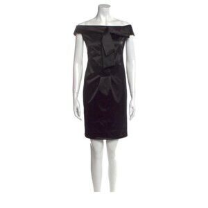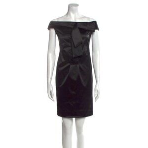 DVF Pia dress is a black satin, off the shoulder cocktail dress. Bow front detail and hidden pockets. Has front snaps and button closures. Fabric: 56% cotton, 42% Polyester, 2% spandex; Combo 93% silk, 7% spandex.