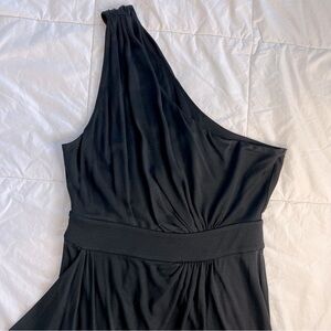 This elegant and classic black one-shoulder dress is perfect for any occasion. Its sleek design offers a sophisticated look. The drape of the dress and the stretch of the fabric offers a flattering look for any occasion.