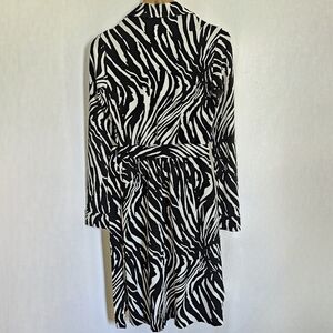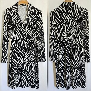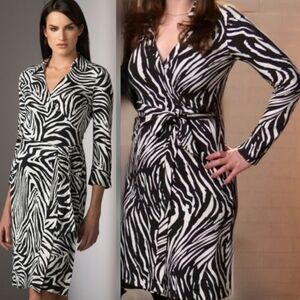 Diane Von Furstenberg Black & White Long Sleeve Animal Print Midi Wrap Dress