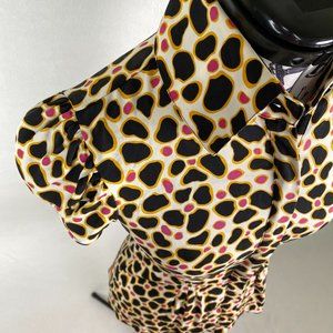 Diane Von Furstenberg Pink/Yellow Animal Print Blouse, Puff Sleeves, Size 0