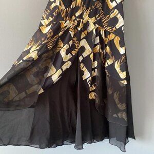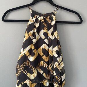 Make a bold yet elegant statement in this DVF silk Olesia dress, featuring an iconic chain-link print, a halter neckline, and a tiered flowy hem. This luxury designer piece is perfect for cocktail parties, elegant dinners, or an effortlessly chic event look. Crafted in pure silk, it offers a lightweight feel with maximum sophistication.