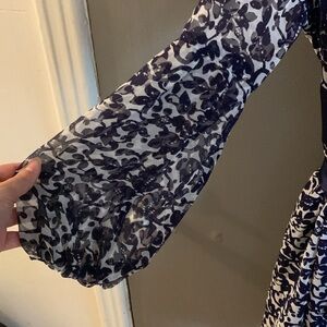 This stunning sundress by Diane Von Furstenberg features a sophisticated wrap design with a tie front, perfect for a wedding guest or cocktail event. The dress showcases a beautiful blue and white color palette, complemented by long bishop sleeves and a flattering v-neckline.
