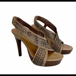Diane Von Furstenberg laser cutout wooden platform sandal heels Sz 8. Excellent condition. Worn twice. Very comfortable