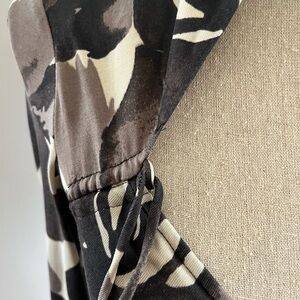 Beautiful VINTAGE Diane Von Furstenburg Wrap Silk Jersey Midi Dress. Black, muted gray, taupe and cream floral pattern.