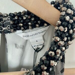 Diane Von Furstenburg Silk Halter Y2K Beaded Dress Black Lace Print. 100% silk. Brand new with tags. Size 8.