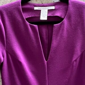 Purple wool 'Aurora' dress by Diane Von Furstenberg. V-neck with flattering darting at chest. Short sleeves with side zip.