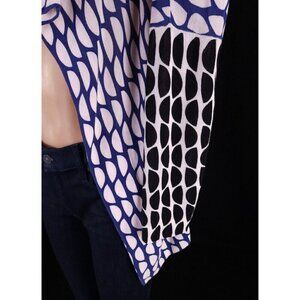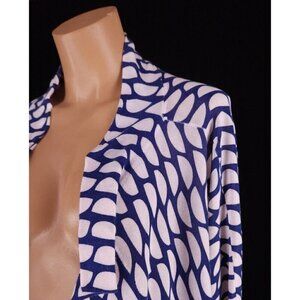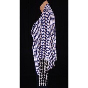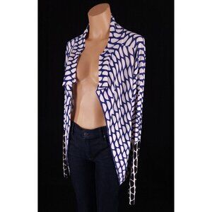Diane von Furstenberg Yenee Mesh Jacket in size small. The colorful geometric pattern and open front design make it a great mix and match piece for any occasion, whether it's travel, casual or business. The jacket/coat length is short and the sleeve length is long, making it a perfect addition for summer, fall, or spring.Constructed from 52% cotton and 42% rayon, this mesh jacket is semi-sheer and unlined, giving it a relaxed fit. It's recommended to dry clean only to maintain its quality. This designer piece is perfect for women who love Lagenlook style and want to add a unique touch to their outfits.