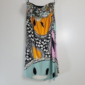 Funky psychedelic pattern strapless dress from Diane Von Fürstenberg. Excellent preloved condition. No stains or tears. 100% silk upper, 48% silk & 52% cotton skirt.