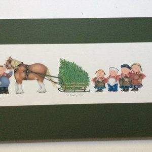 It is a nice and almost new wood wall plaque. Funny image of a horse pulling a Christmas tree with a family.