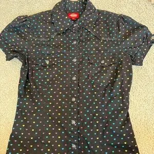Short sleeved shirt with black pearlescent snaps. Multicoloured heart print.