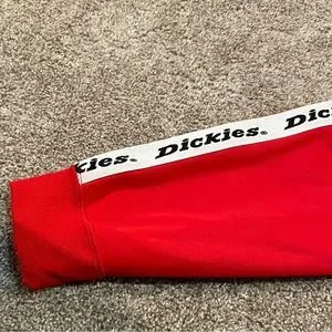 Features the iconic Dickies patch embroidered on the front and Dickies logo writing in contrasting black + white down each sleeve.