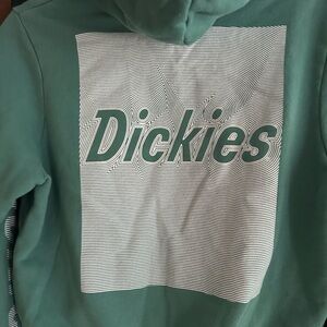 Casual teal hoodie featuring Dickies logo on chest and sleeve. Comfortable fit.