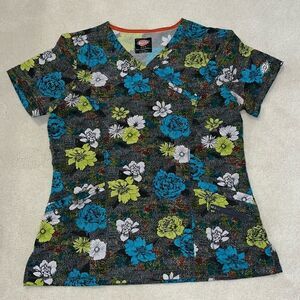 Dickies Womens Medical Scrub Top Flowers Green Blue with Black Background Front Pockets SZ M