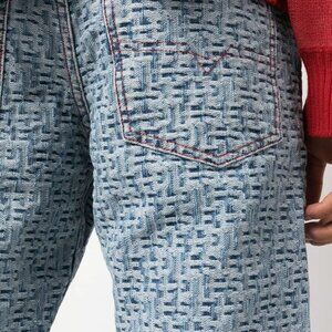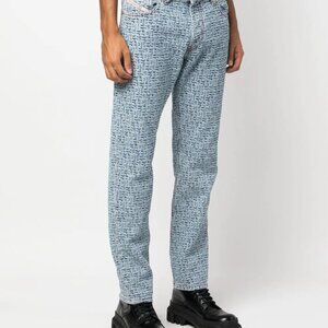 Lightwash Diesel straight leg denim with all-over textured logo weave. Red embroidery accents, and all hardware is logo stamped. Button fly. Feels like 100% cotton.