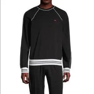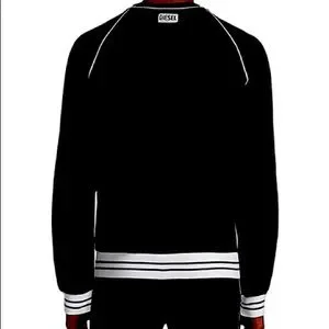 Two-piece cotton jersey pyjama set, comprising a long-sleeved top and trousers. Both items feature contrast topstitching and striped ribbed trims. Branded with a D initial on the left chest and an all-over Diesel outline waistband. Rib: 70% cotton/27% polyester/3% elastane. Elastic trim: 59% nylon/27% polyester/14% elastane. Machine wash. Imported.