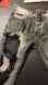 Edgy Diesel jeans with heavy distressing. Black and gray tones. Cropped ankle length.
