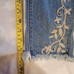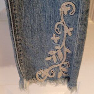 Distressed jean with nice cream floral embroidery on left back pocket and at the calf area on each leg. A llittle bit boho and dress up or down.