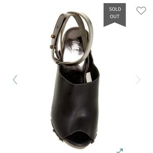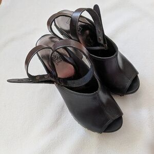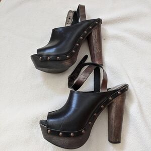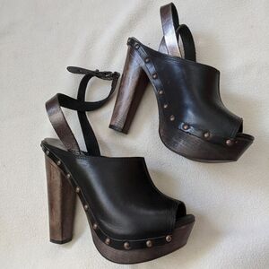 Peep toe - Covered vamp - Wrap around ankle strap with adjustable notch closure - Studded trim detail - Wooden heel and platform - Approx. 5.25" heel, 1.25" platform - Imported Materials