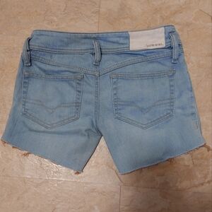 Trendy sky blue denim shorts. Features frayed edges. Classic pocket style. Ideal for casual outings.