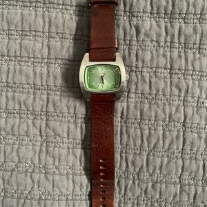 Brown leather band with green face. Wear on band as shown. Requires new battery.
